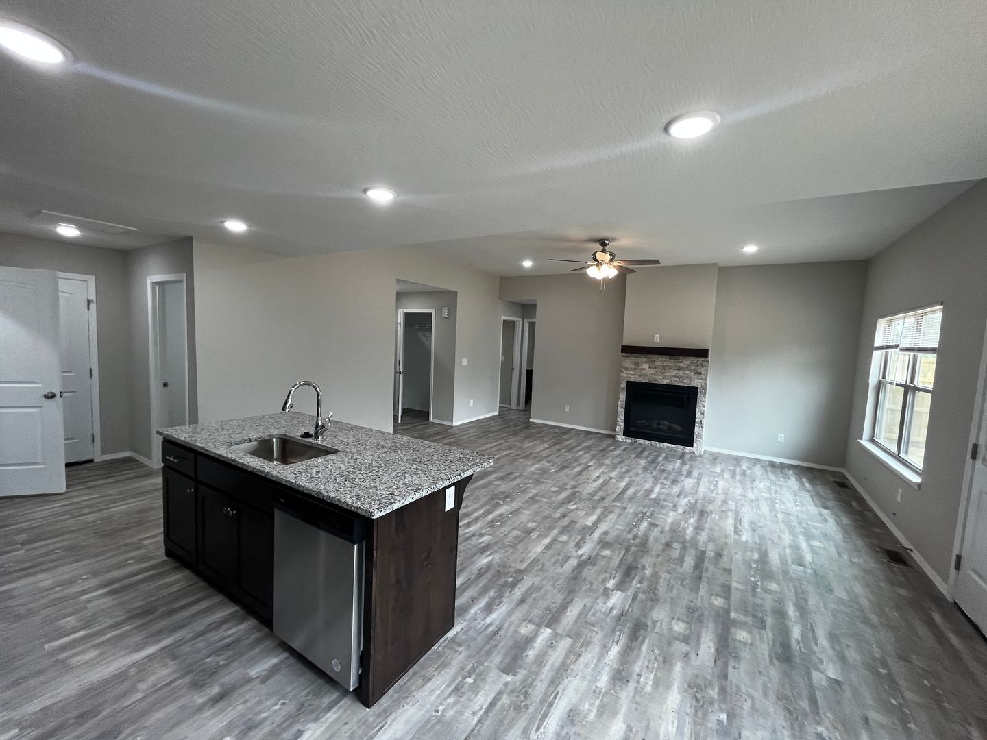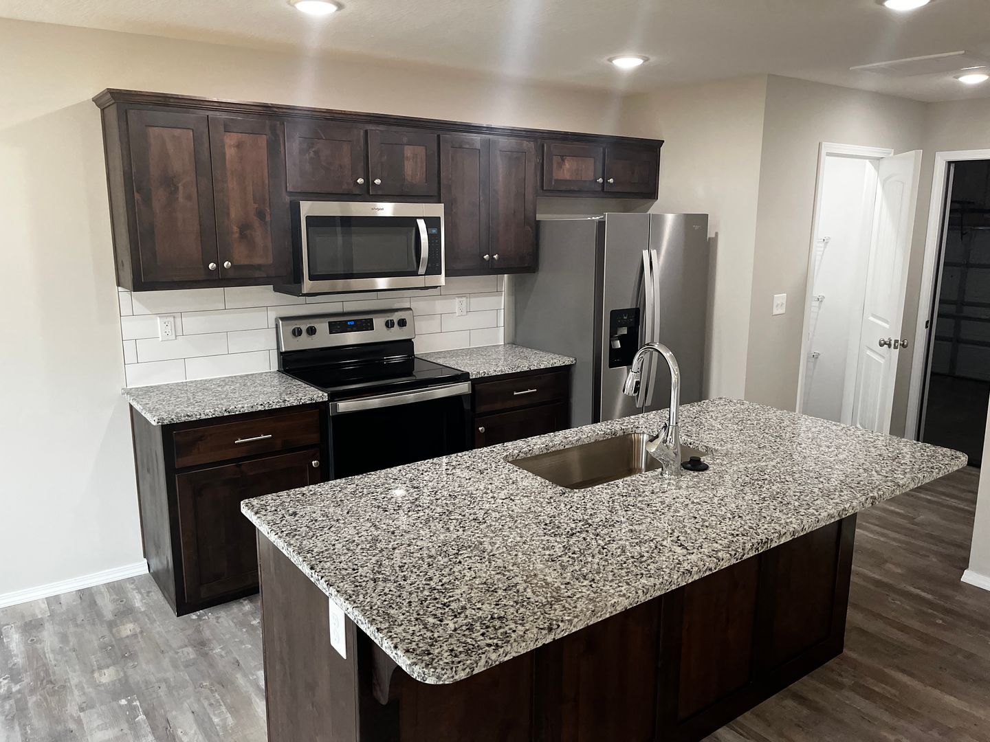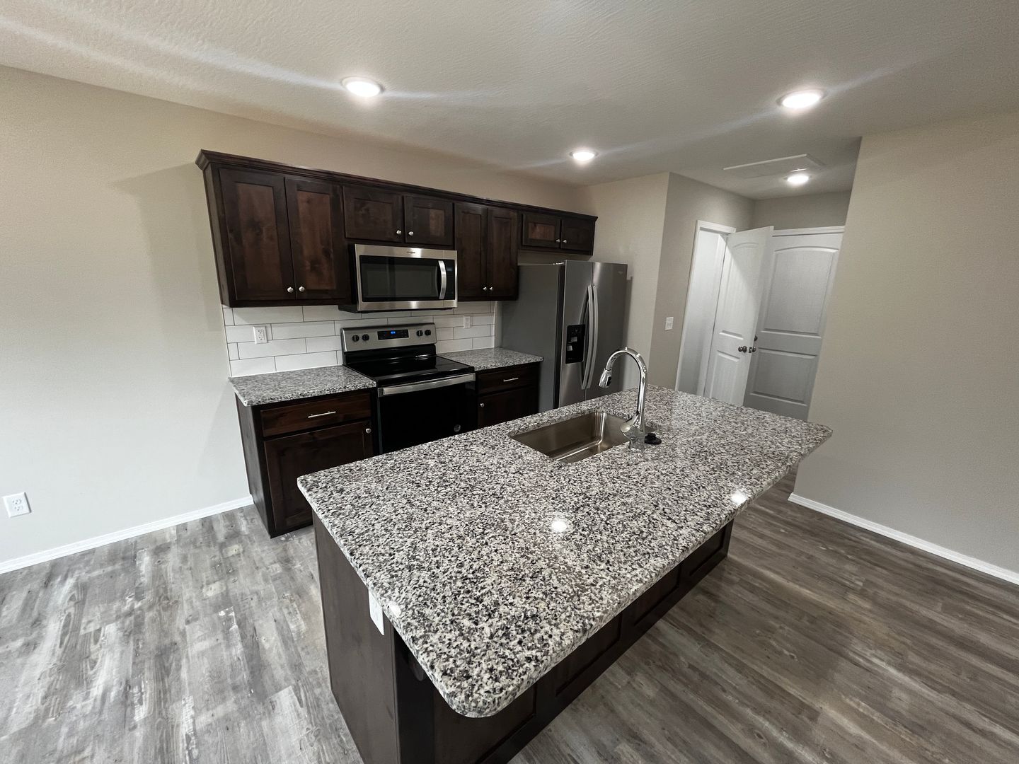 The interior offers raised ceilings, LED lights, open concept, vinyl plank flooring, split floor plan, and tons of natural light. The kitchen is awesome….hosting new appliances, deep stainless farm sink, granite countertops, granite island, walk-in pantry, dark stained cabinets, and subway tile. Sharp.