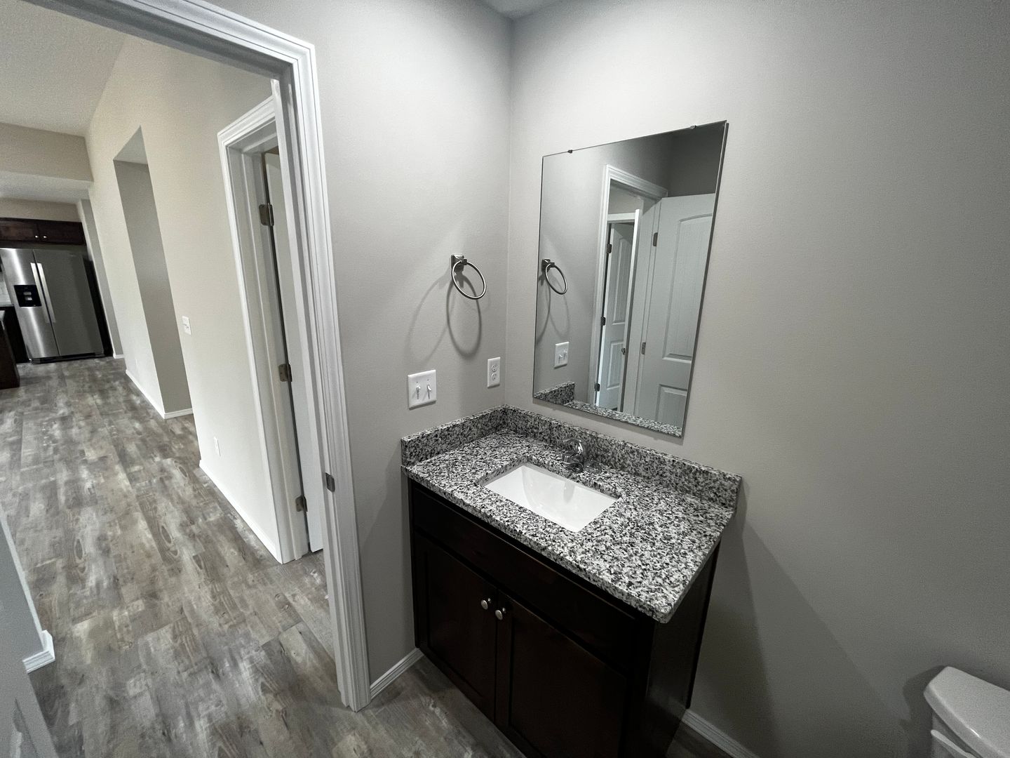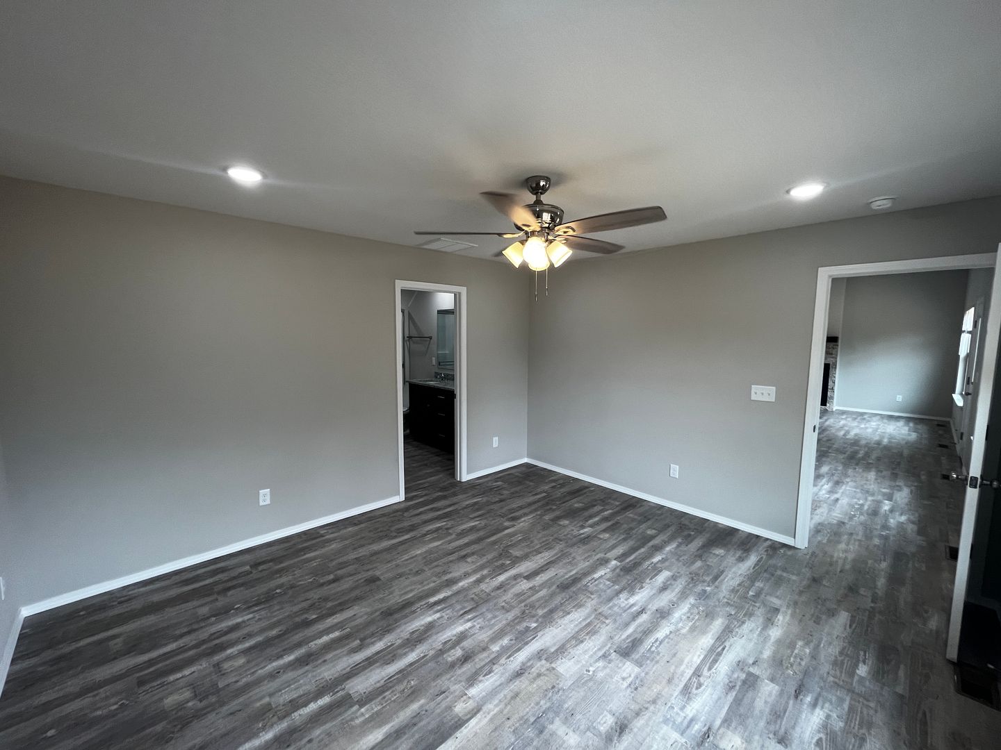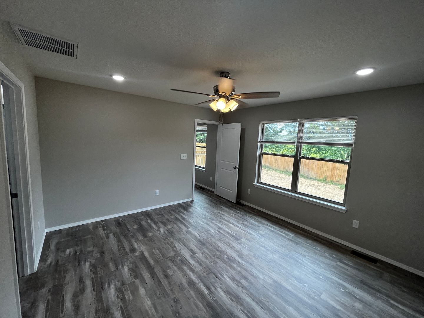 The interior offers raised ceilings, LED lights, open concept, vinyl plank flooring, split floor plan, and tons of natural light. The kitchen is awesome….hosting new appliances, deep stainless farm sink, granite countertops, granite island, walk-in pantry, dark stained cabinets, and subway tile. Sharp.