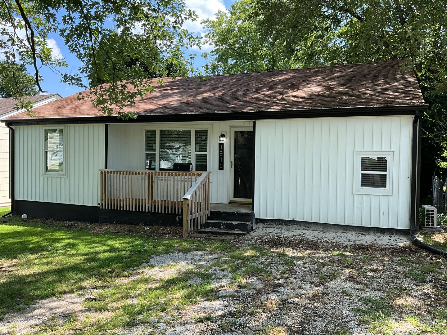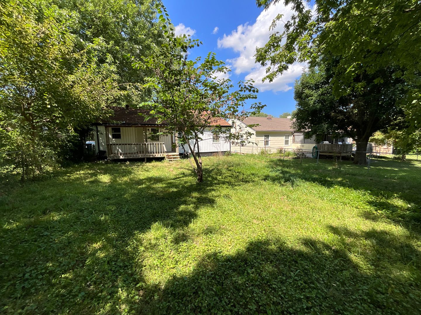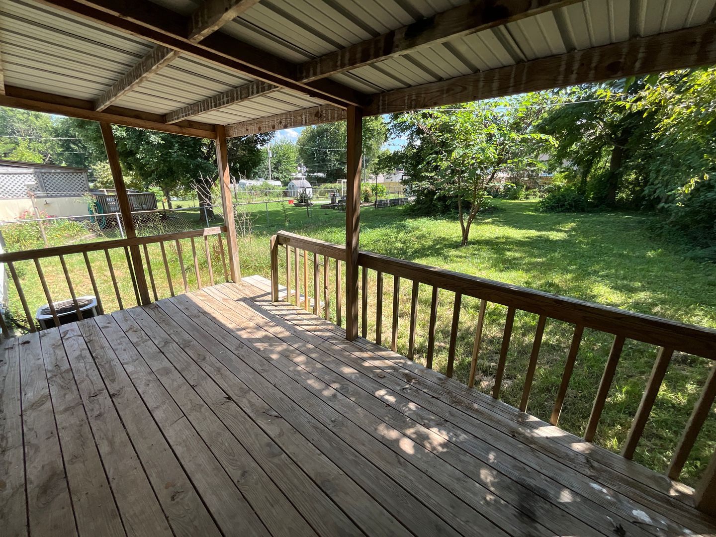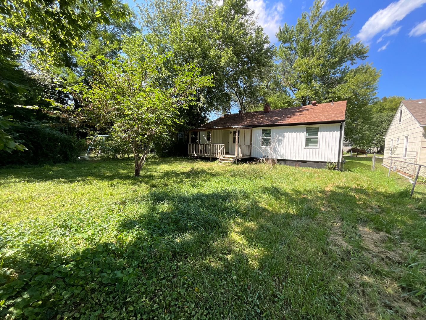 The exterior offers a covered front and back porch, fenced yard, and mature trees.